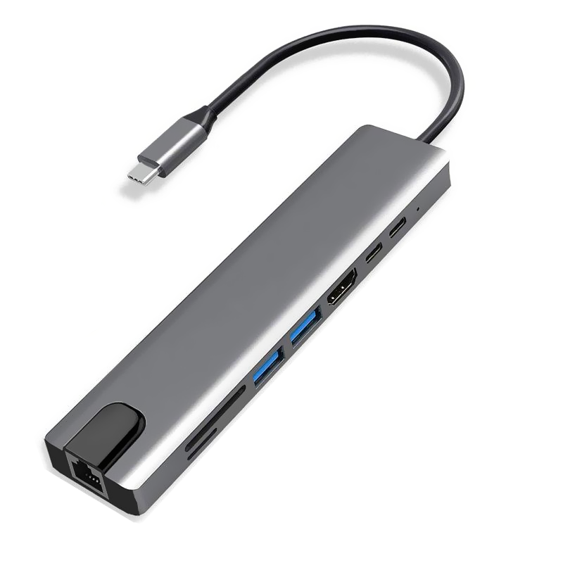 Adaptador Hub Argom, Tipo C 8 en1, HDMI 4K, RJ45, SD, Micro SD, USB 3.0X2, ARG-UB-0093