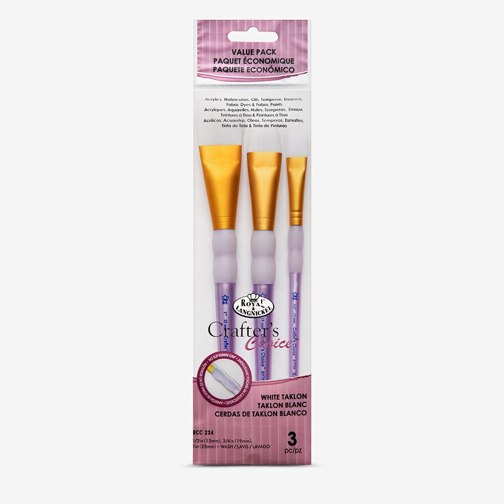 - El juego de pinceles Royal Brush Golden Taklon incluye pinceles de 1 pulgada, 2 pulgadas y 3 pulgadas de ancho con mangos de madera dura resistentes. Ideal para pinturas acrílicas, barnices, esmaltes, acuarelas y adhesivos. Los pinceles están hechos de taklon blanco, taklon dorado y pelo de camello.