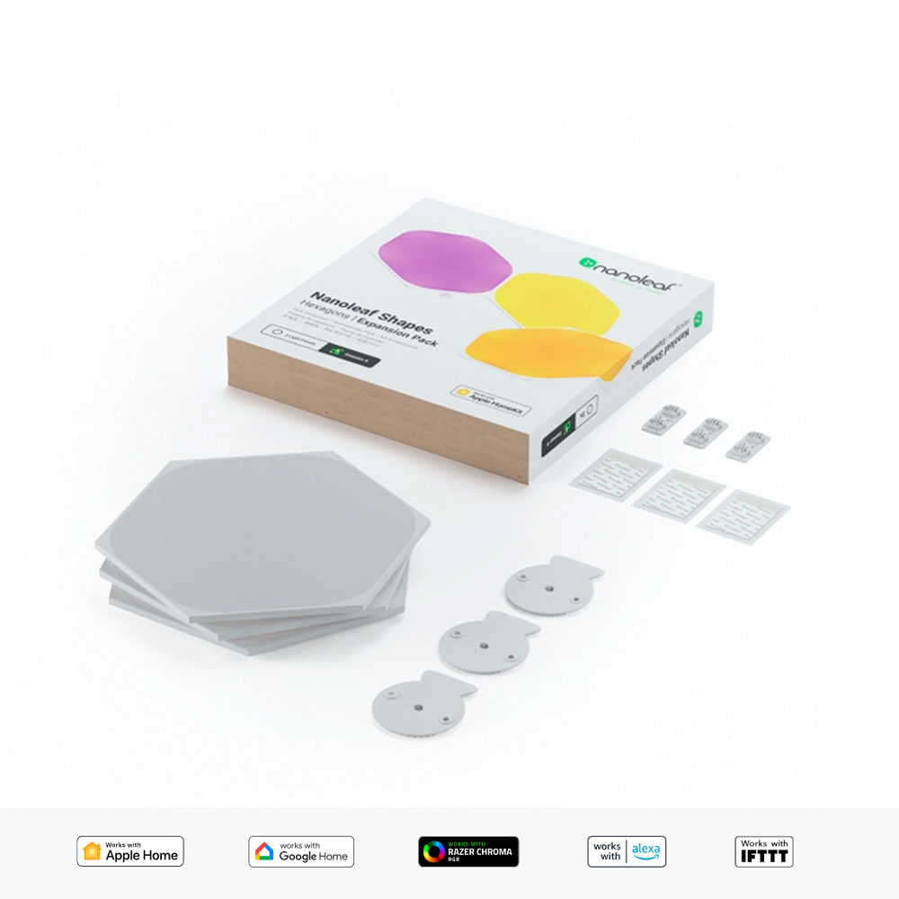 Amplíe su diseño con los paquetes de expansión de 3 paneles. Conecte hasta 21 paneles hexagonales con una fuente de alimentación (para diseños más grandes, obtenga una fuente de alimentación adicional en la tienda Nanoleaf). También disponible en triángulos y minitriángulos: mezcle y combine cualquier forma de panel de las líneas de productos Nanoleaf Shapes o Elements (modelos NL42/NL47/NL48/NL52). Tenga en cuenta que este paquete requiere un kit Shapes Smarter para funcionar.