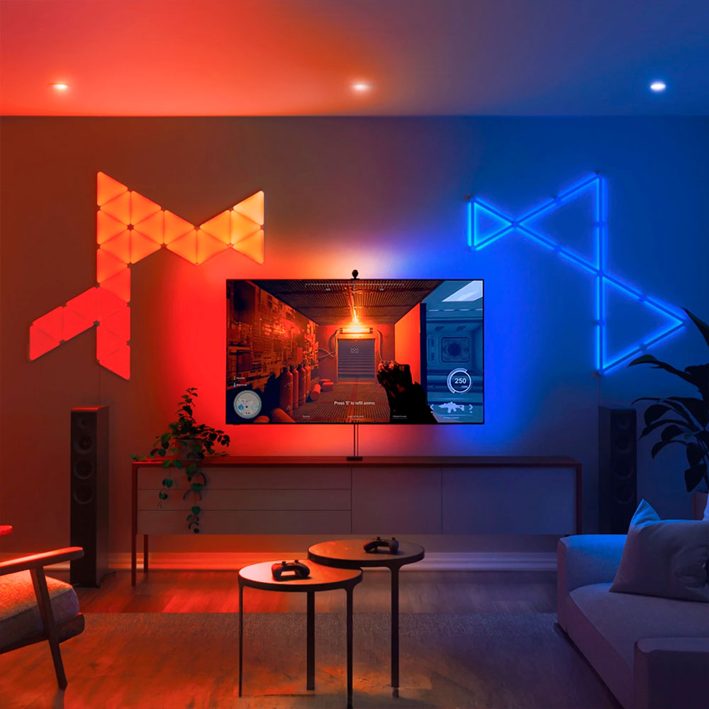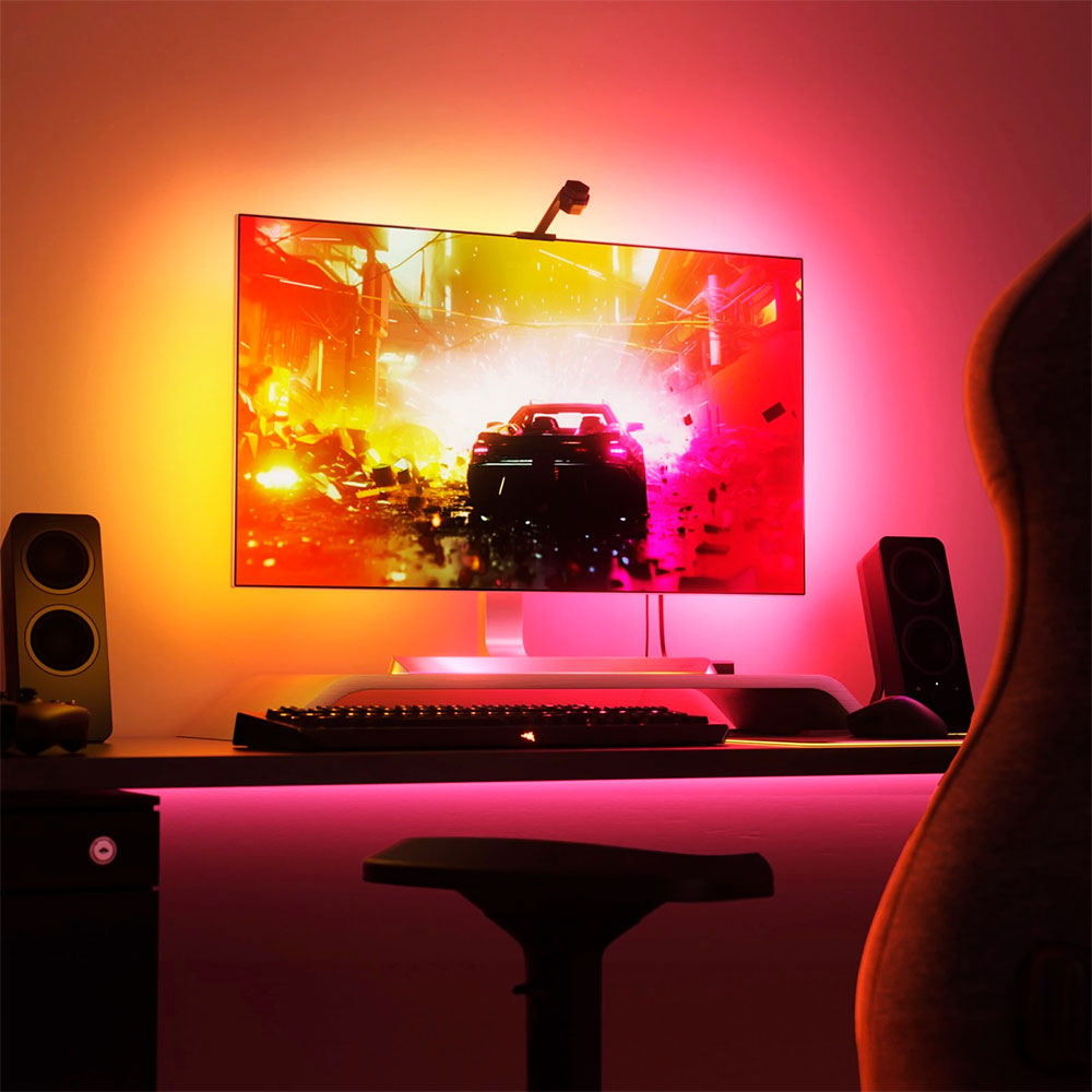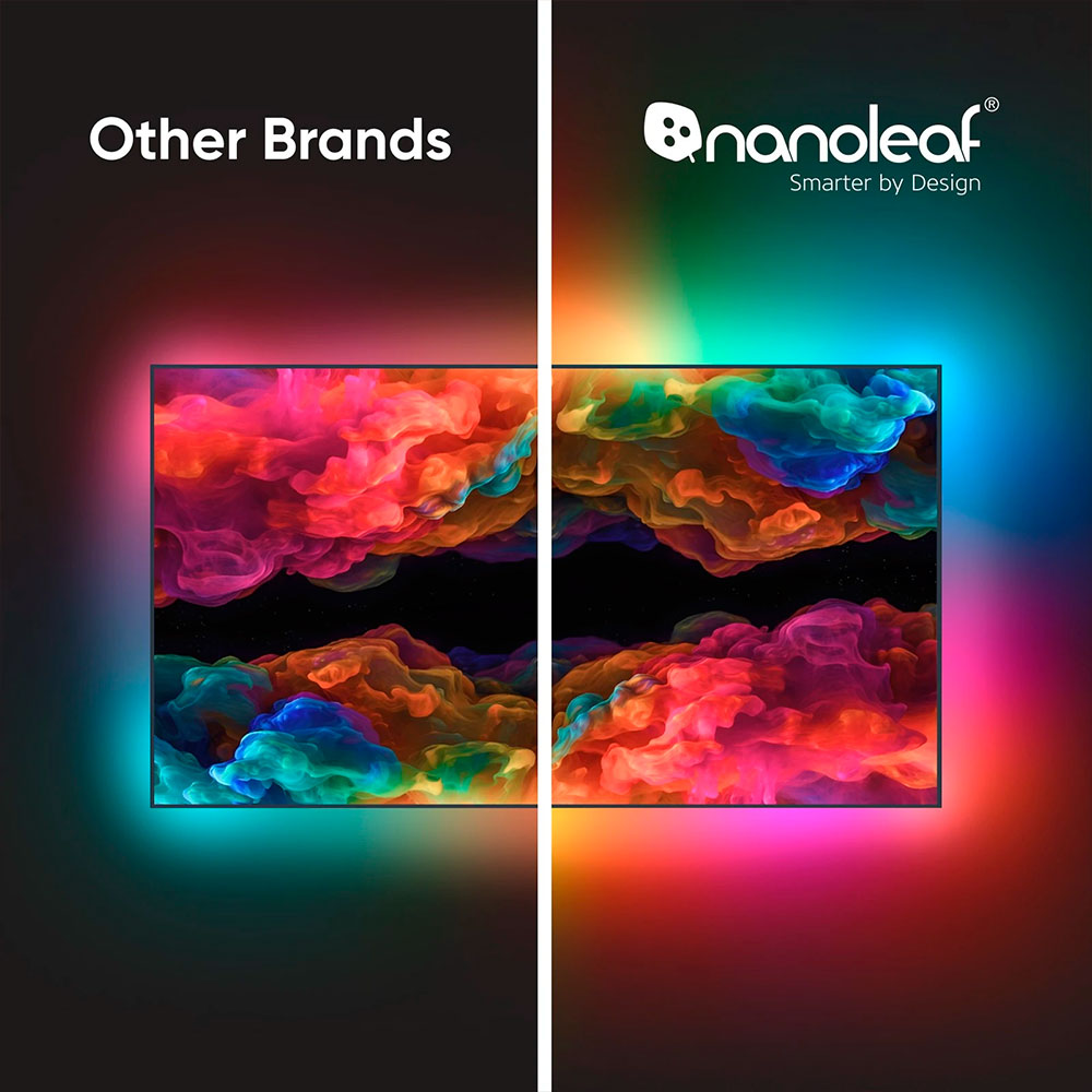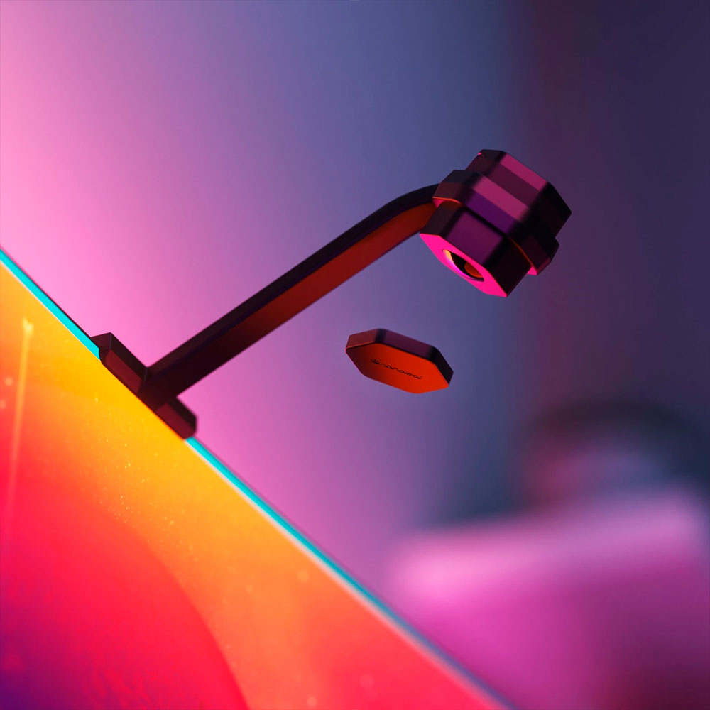 Lleva tu entretenimiento más allá de la pantalla. Nanoleaf 4D es un kit de cámara con espejo de pantalla que sincroniza los colores de la pantalla con la tira de luces LED de gradiente direccionable montada detrás de ella.