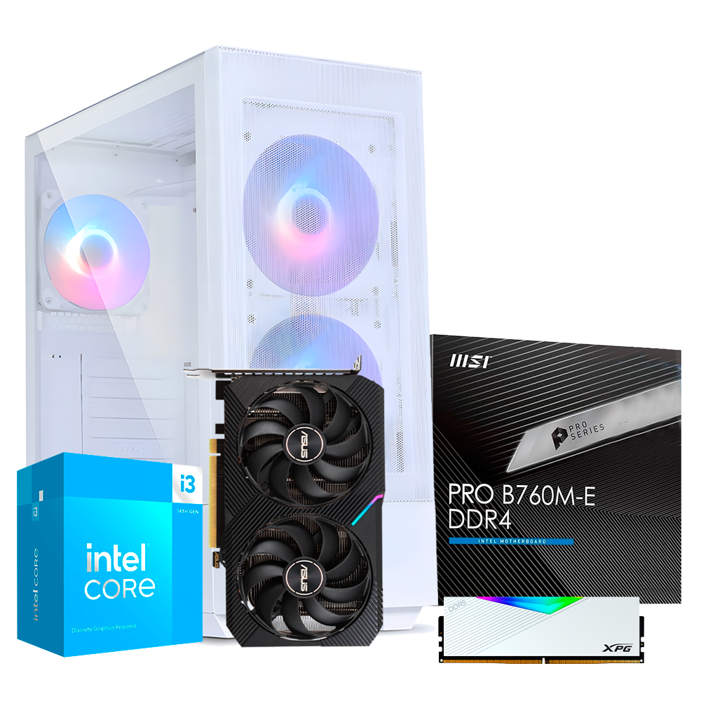 La PC Starlight Core ofrece un balance perfecto de potencia y eficiencia, ideal para juegos en alta calidad con el procesador Intel i3 14100 y la gráfica RTX 3050.