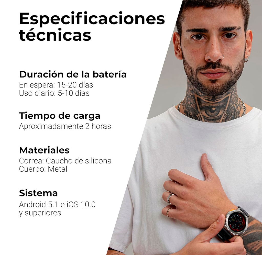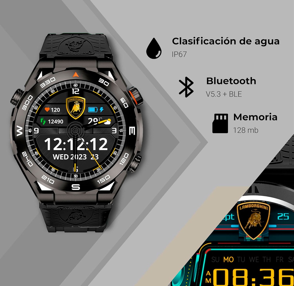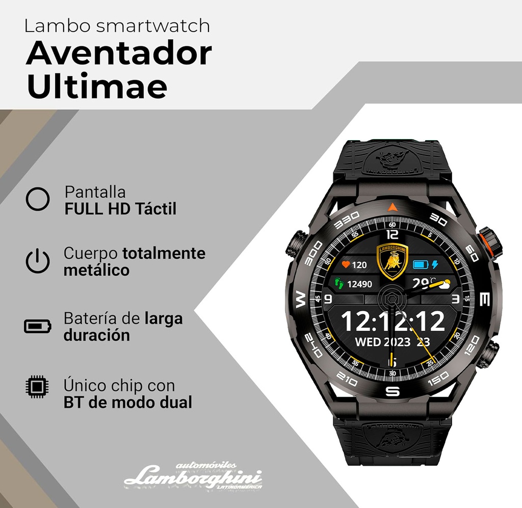 El Smartwatch Aventador V12 GT combina un diseño de lujo con funciones avanzadas. Su pantalla AMOLED de 1.43" ofrece una calidad visual increíble, ideal para monitorear tu actividad diaria. Con un cuerpo metálico premium y resistencia al agua IP67, está diseñado para durar.